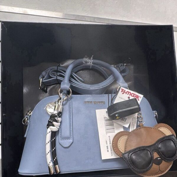 $34.99A stylish blue handbag featuring a cute bear keychain.