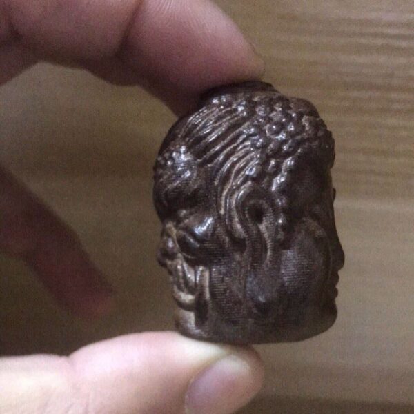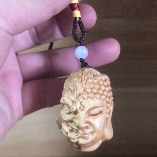 $36.00A beautifully carved wooden pendant featuring a serene Buddha face, perfect for spiritual wear or as a decorative piece.