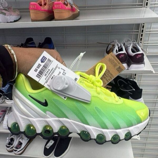 These vibrant Nike Air Max Plus sneakers feature a striking green and yellow design with a unique bubble sole for added comfort. Perfect for both casual wear and athletic activities.