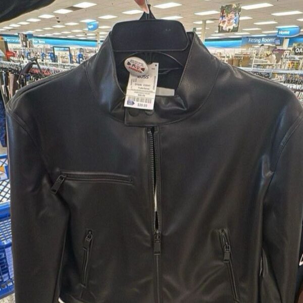 A stylish black leather jacket featuring a cropped design with multiple zippered pockets. Perfect for adding an edgy touch to any outfit.
