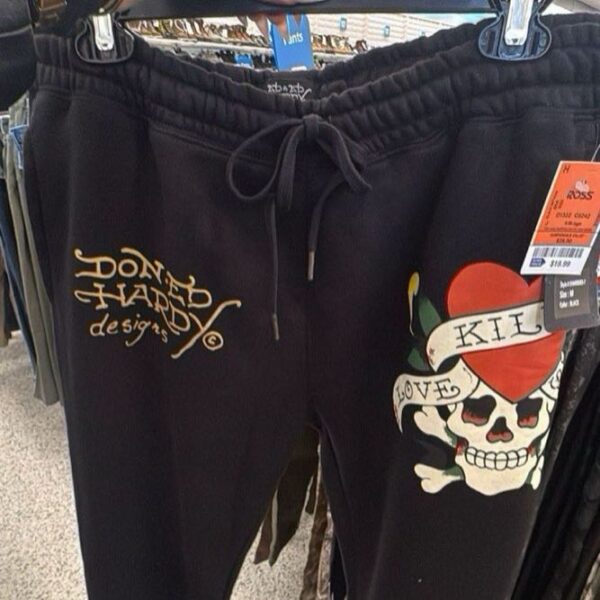 These black sweatpants feature unique Ed Hardy designs, including a skull and heart graphic. They are comfortable and perfect for casual wear.