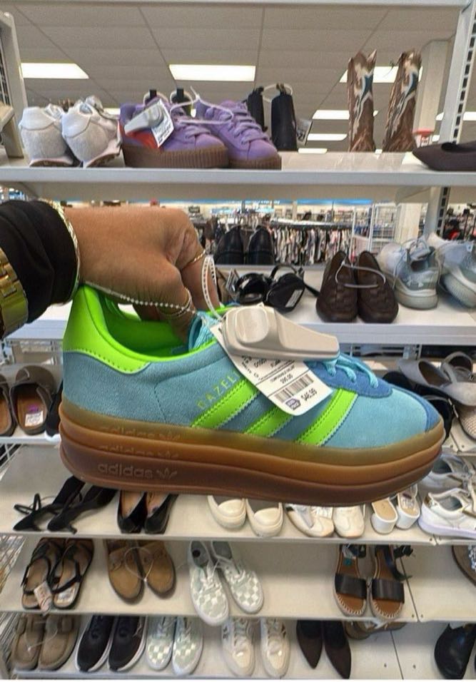 These Adidas Gazelle sneakers feature a vibrant blue and green colorway, perfect for casual wear. The classic design combines comfort and style.