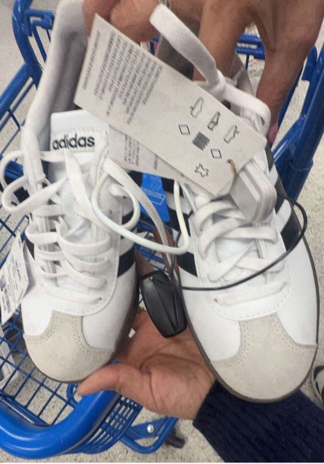 White and black Adidas sneakers with tags attached.