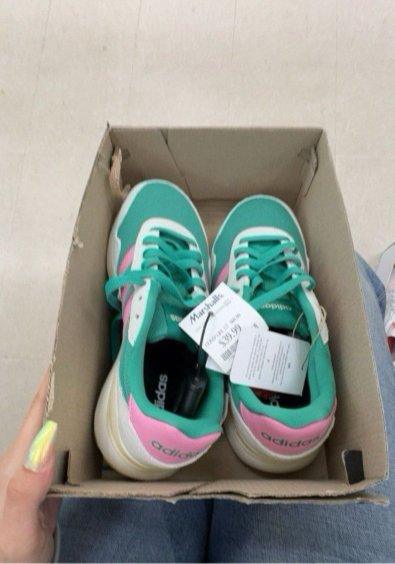 A pair of teal and pink Adidas sneakers in their original box.