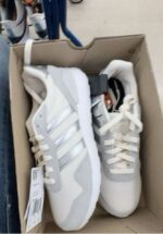 A pair of white Adidas sneakers featuring silver accents and a classic design.