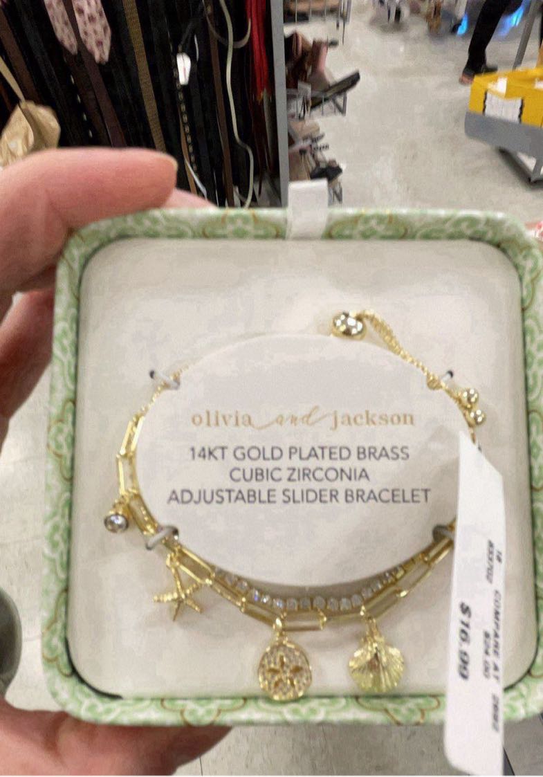 14kt gold plated brass bracelet featuring cubic zirconia and adjustable slider design.