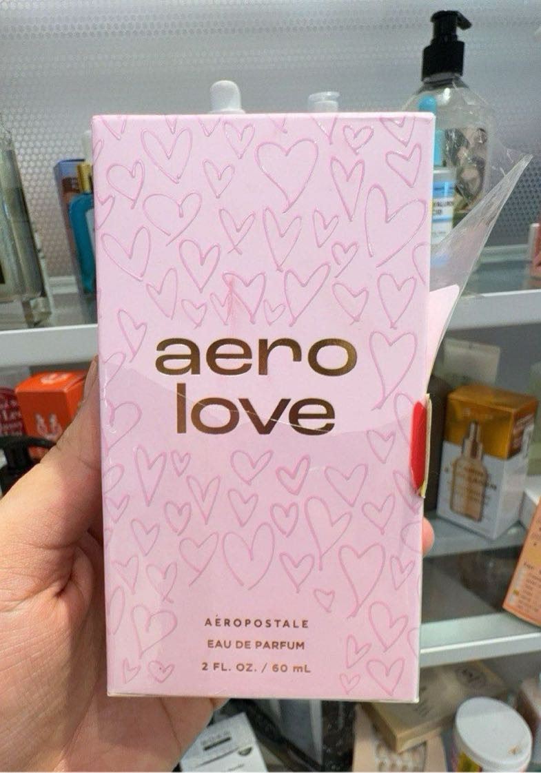Aero Love by Aeropostale is a floral fragrance presented in a pink box adorned with heart designs.