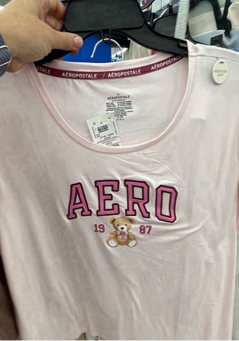 A soft pink t-shirt featuring a teddy bear graphic and ‘AERO 1987’ text.