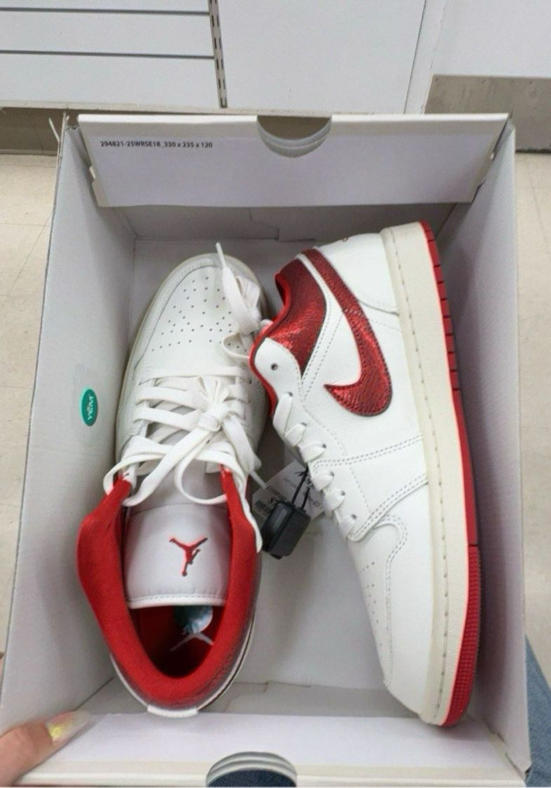 A pair of Air Jordan 1 Retro High OG sneakers featuring a white and red colorway.