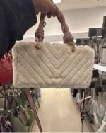 A stylish faux fur handbag with a quilted design and pink handles.