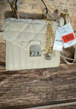 A stylish cream-colored handbag with a quilted design and a faux fur flap. Features gold-tone hardware and a detachable chain.