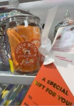 A pair of crew socks packaged in a decorative jar, featuring a vibrant orange design.