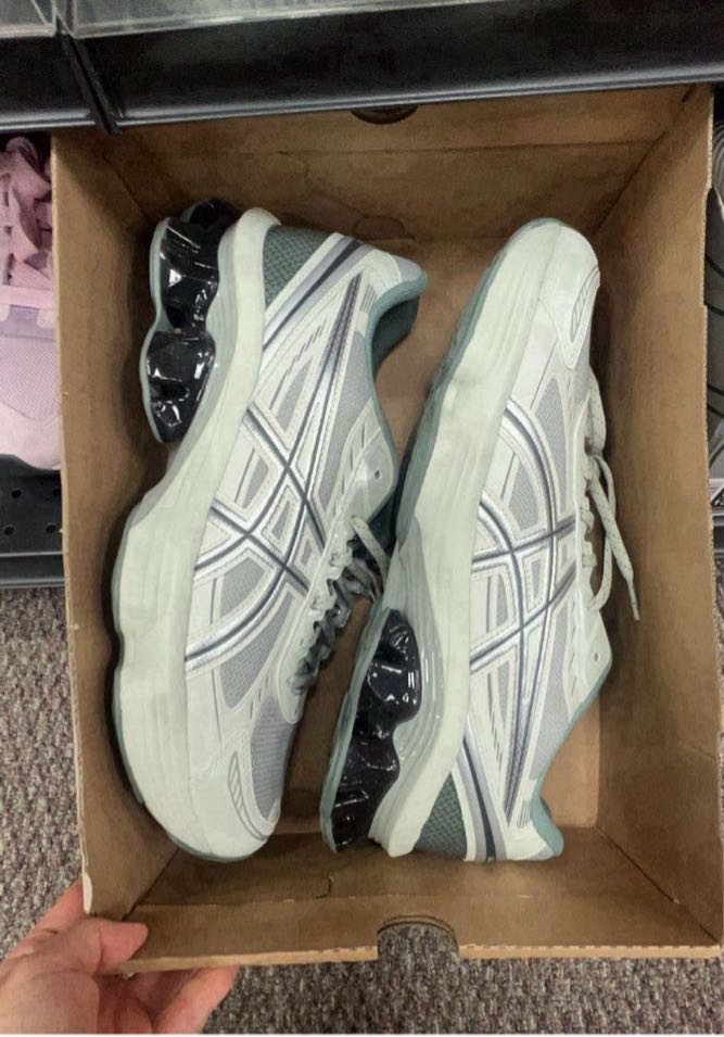 A pair of ASICS running shoes featuring a grey and white design with a cushioned sole.