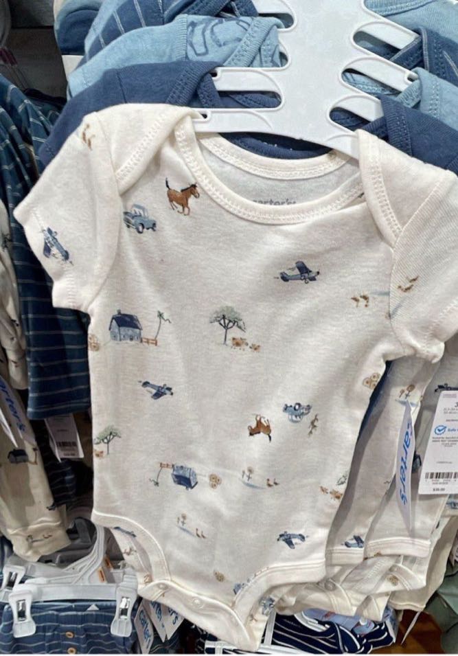 A soft, short-sleeve baby bodysuit featuring a playful farm-themed print with animals and vehicles.