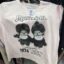 A set of two baby t-shirts, one orange and one with a playful print featuring various designs.