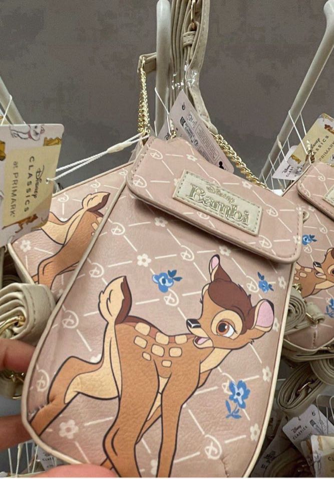 A cute crossbody bag featuring a playful Bambi design, perfect for carrying essentials. The bag has a stylish pink background with floral accents.