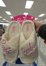 Cozy and stylish slippers featuring the Barbie logo in pink embroidery.