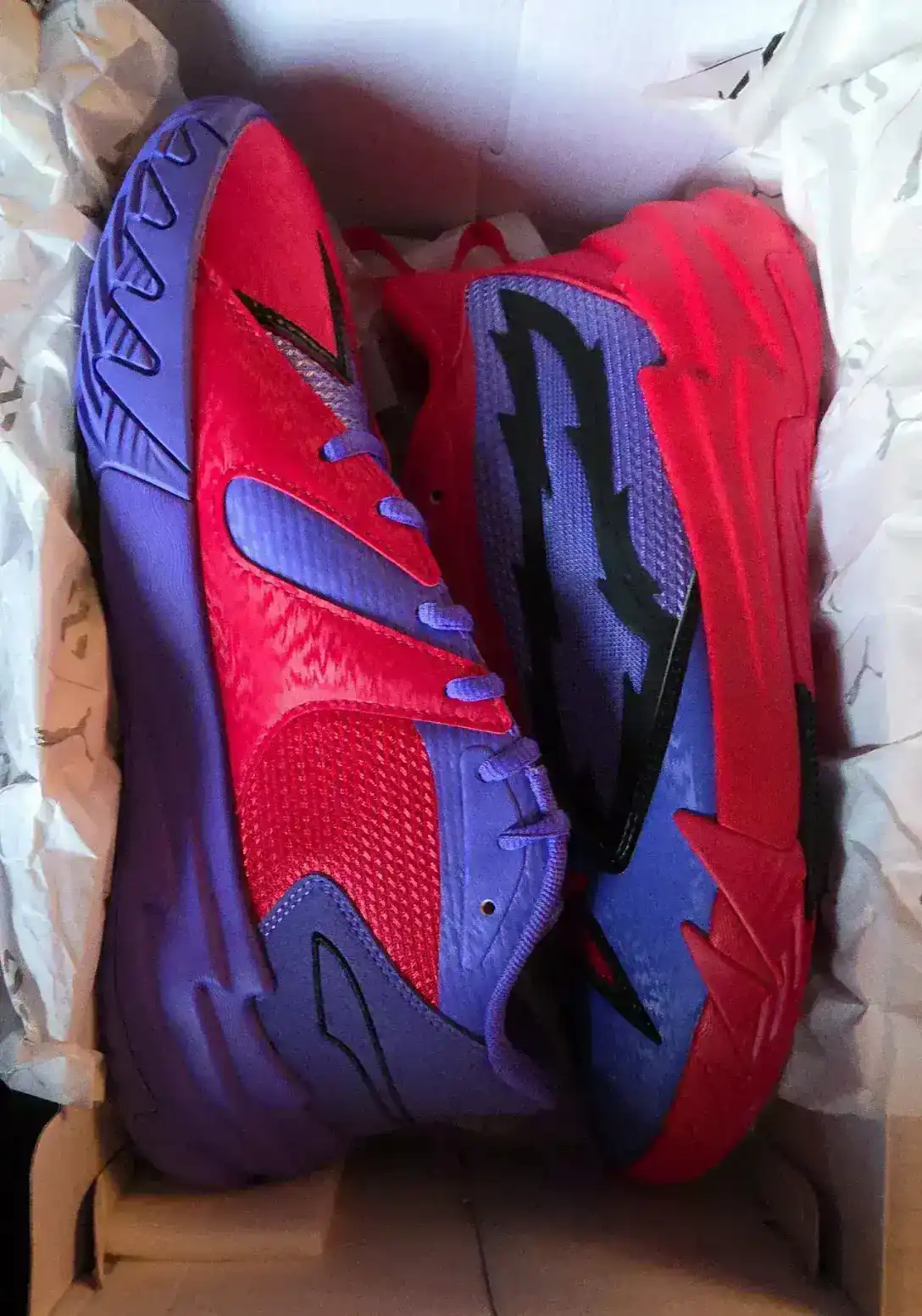 A pair of vibrant basketball shoes featuring a red and purple color scheme. Designed for performance on the court.