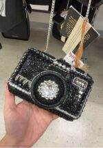 A stylish beaded clutch designed to resemble a camera, featuring intricate beadwork and a chain strap.