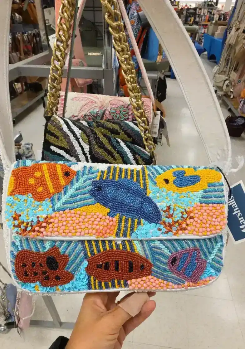 A colorful beaded clutch featuring a vibrant fish design, perfect for adding a playful touch to any outfit.