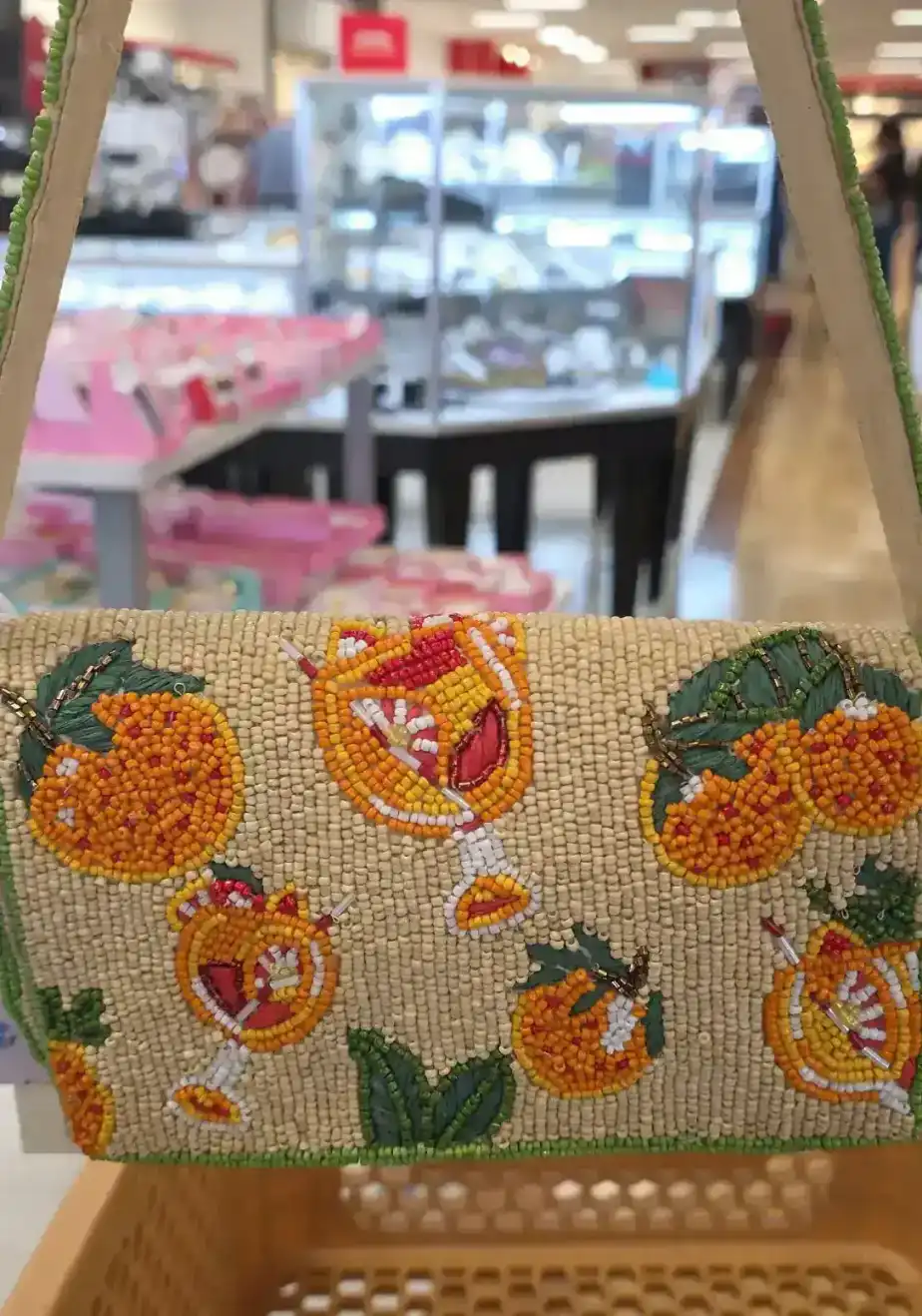 A decorative clutch bag featuring vibrant beaded fruit designs.