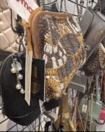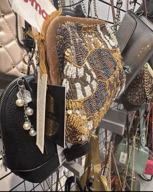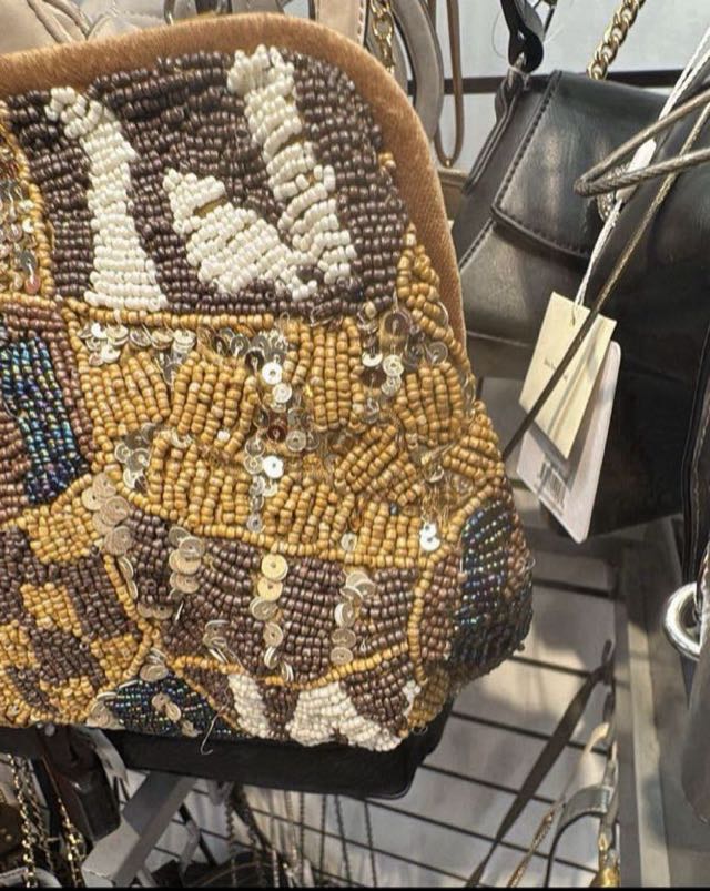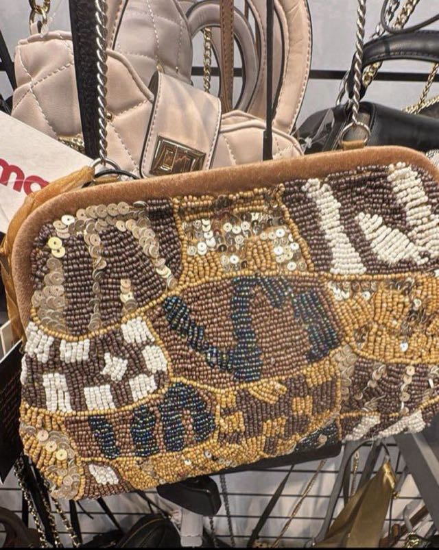 A stylish handbag adorned with intricate beadwork in various colors and patterns.