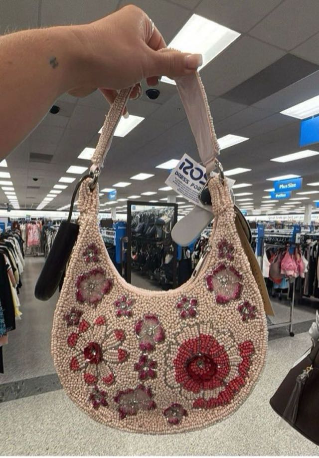 A stylish beaded handbag featuring floral designs in pink and red hues. Perfect for adding a touch of elegance to any outfit.