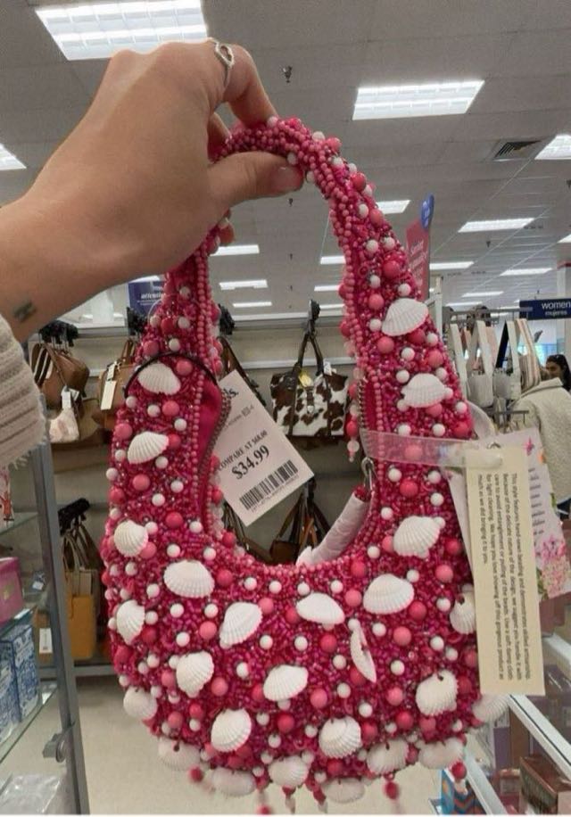 A vibrant pink handbag adorned with beads and shells, perfect for adding a pop of color to any outfit.