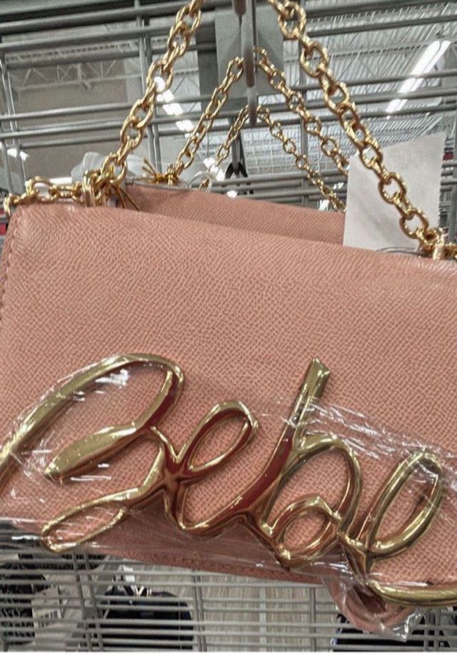 A stylish pink handbag featuring a gold-tone ‘Bebe’ logo on the front.