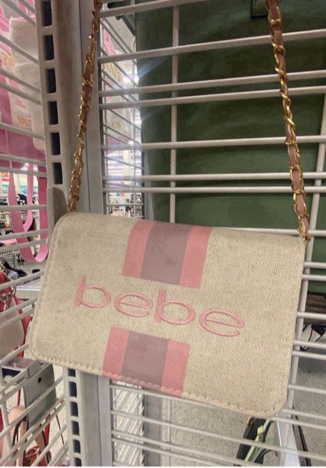 A stylish handbag featuring a beige and pink design with a chain strap. Perfect for casual outings or special occasions.