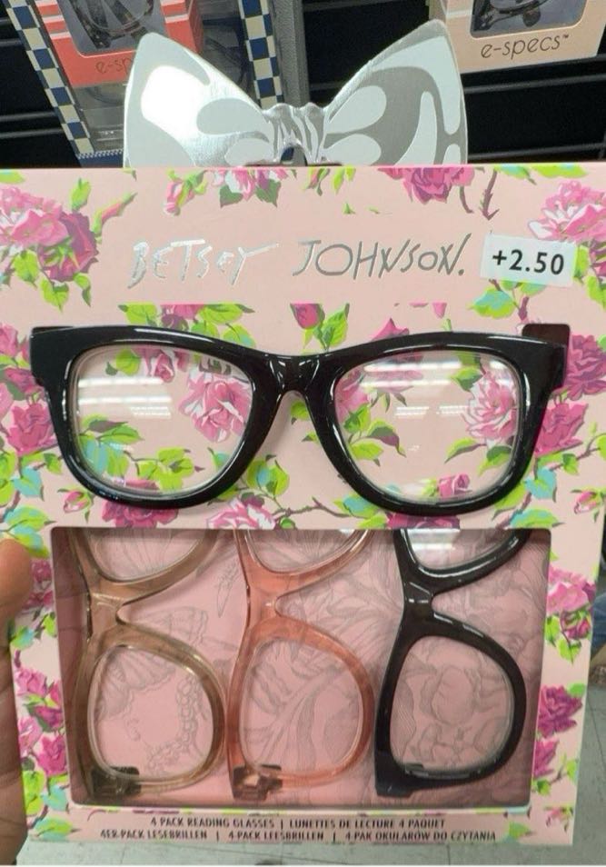 A set of four stylish reading glasses in various colors, packaged with a floral design.