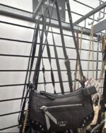 Stylish black crossbody bag with a zippered compartment and decorative studs.