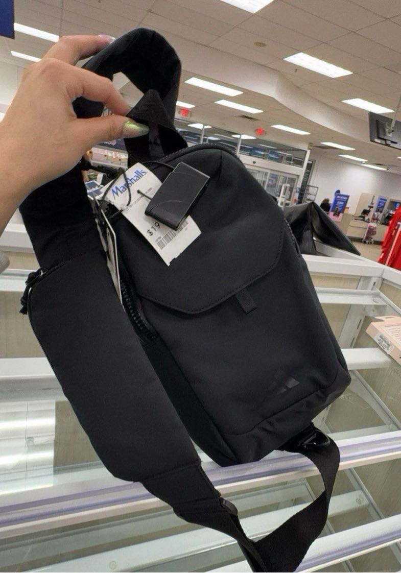 A sleek black crossbody bag with a zippered compartment and adjustable strap.