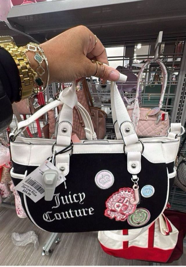 A stylish black and white handbag featuring the Juicy Couture logo and decorative patches. Perfect for everyday use or a night out.