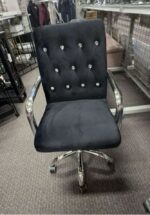 A stylish black office chair with a tufted design and chrome accents, featuring wheels for mobility.