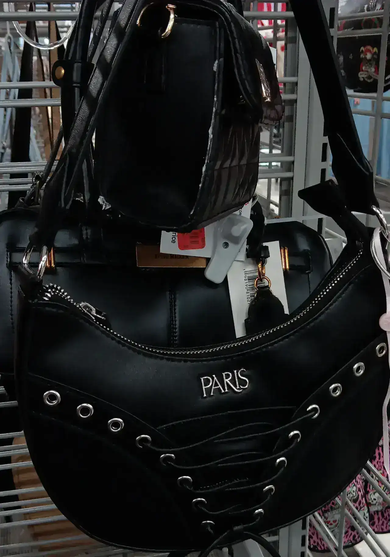 A stylish black handbag featuring a unique lace-up design with the word ‘PARIS’ embroidered on the front. It includes a detachable strap for versatile carrying options.