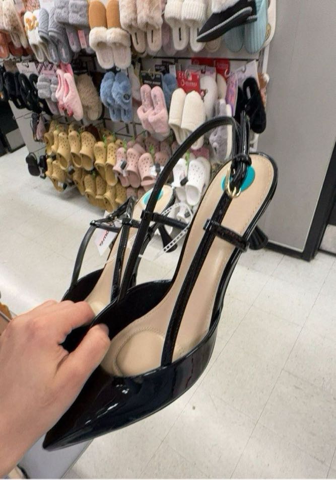 Stylish black patent leather heels with a pointed toe and slingback design.