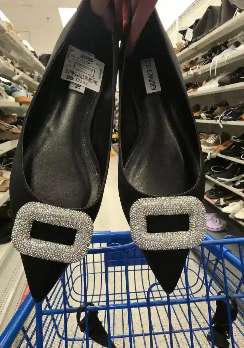 Elegant black flats featuring a pointed toe and embellished buckle detail.