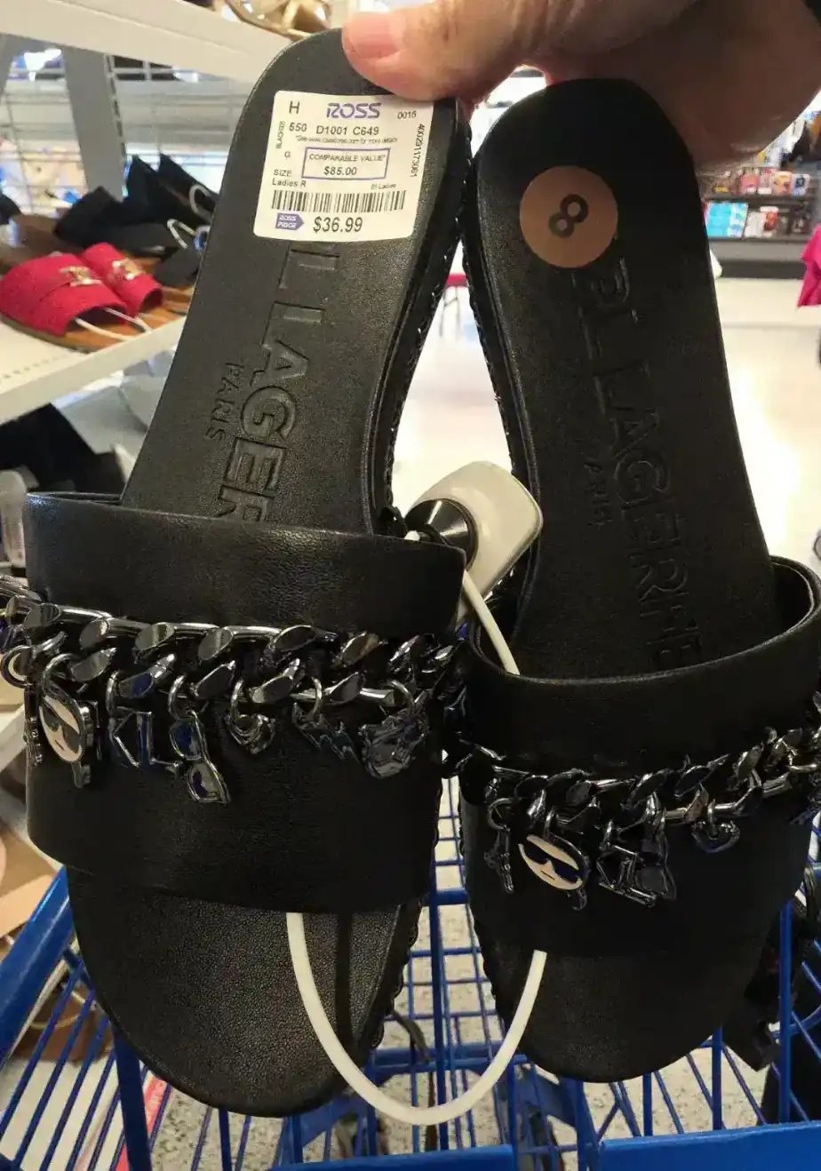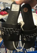 Stylish black slide sandals featuring a chain detail.