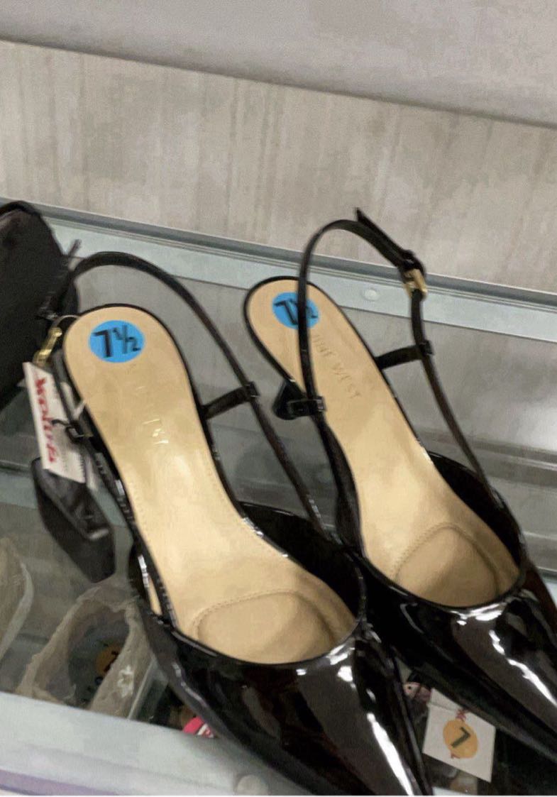 Elegant black slingback heels with a pointed toe and a glossy finish.