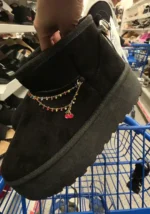 Stylish black suede ankle boots featuring decorative chain and charm embellishments.