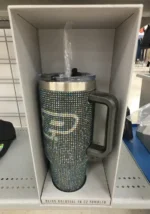 A stylish 46 oz tumbler adorned with sparkling rhinestones, perfect for keeping beverages hot or cold.