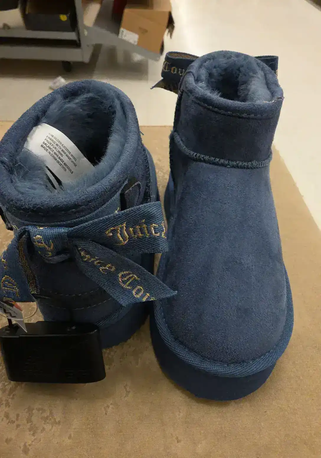 Stylish blue suede boots with a soft interior and decorative ribbon.
