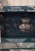 A stylish borosilicate glass teapot accompanied by matching teacups, perfect for tea lovers.