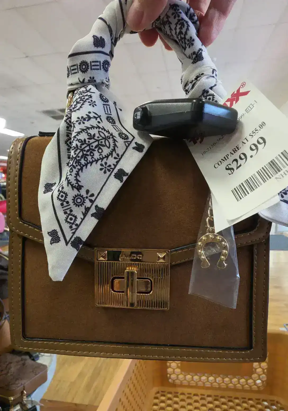 A stylish brown handbag featuring a decorative scarf and a gold-tone clasp.