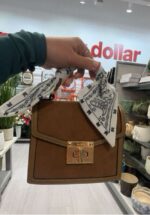 A stylish brown handbag featuring a gold clasp and a decorative scarf tied to the handle.