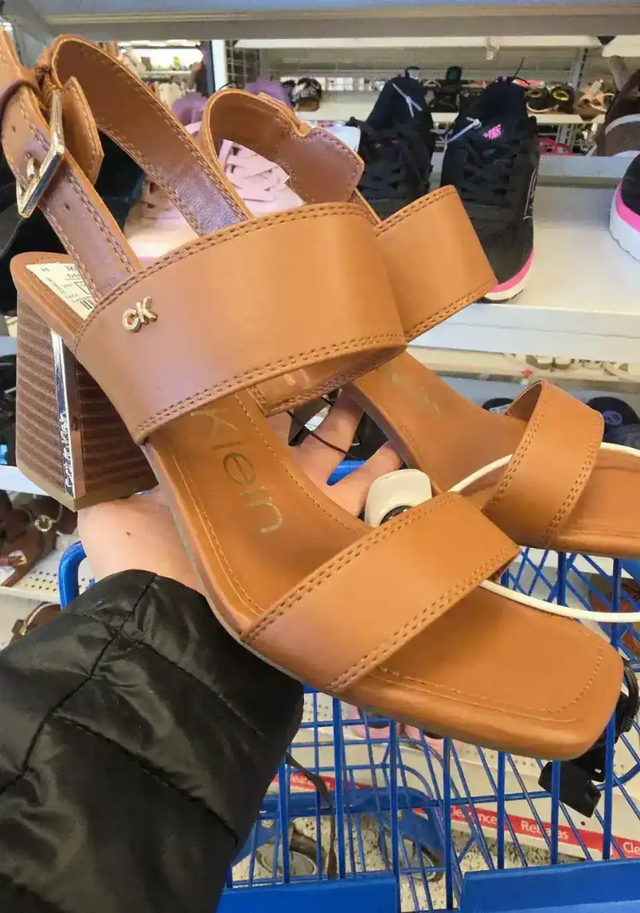Stylish brown heeled sandals with a modern design and adjustable strap.