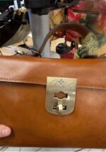 A stylish brown leather handbag with a metal clasp and a shoulder strap.