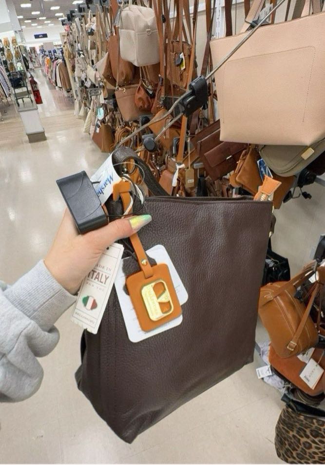 A stylish brown leather tote bag with a tag attached, perfect for everyday use.