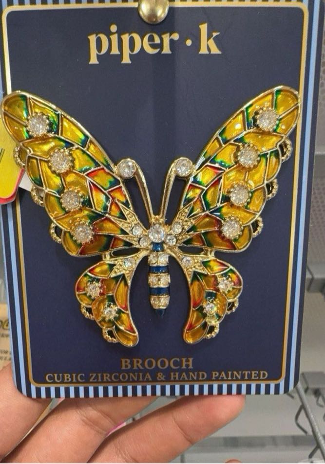 A colorful butterfly brooch featuring cubic zirconia and hand-painted details.